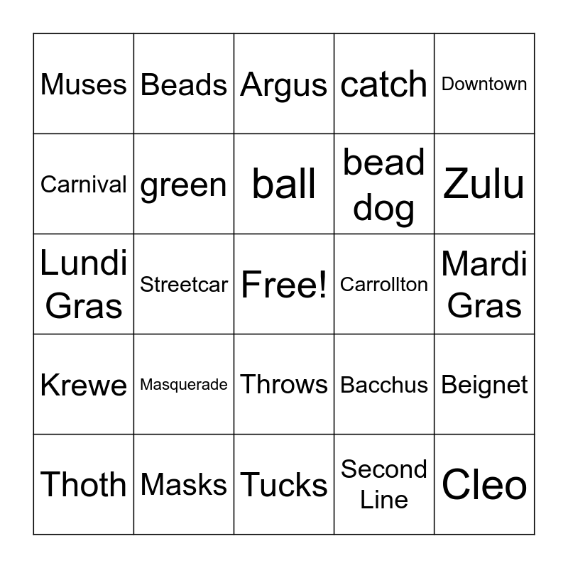 This bingo card has a free space and 56 words: Endymion, Thoth, Iris, Muses, Tucks, purple, green, gold, bead dog, New Orleans, catch, throw me something, sidewalk, drivers side, passenger side, Uptown, Downtown, Streetcar, Hermes, Cleo, Carrollton, Okeanos, Bacchus, Argus, French Quarter, ball, captain, Rex, Zulu, Jazz, Praline, Moon Pie, Jambalaya, Gumbo, Mardi Gras, Carnival, Lundi Gras, King Cake, Krewe, Beads, Throws, Doubloons, Floats, Parade, Flambeaux, Masquerade, Masks, Feathers, Glitter, Lagniappe, Second Line, Neutral Ground, Lent, Ash Wednesday, Beignet and r.