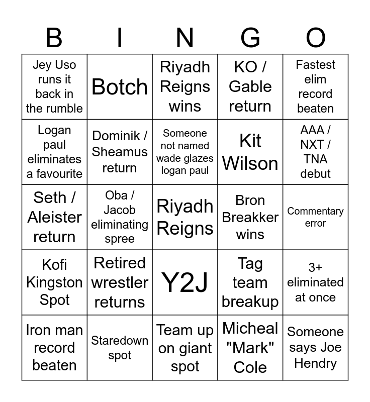 This bingo card has a free space and 24 words: Retired wrestler returns, Staredown spot, Someone not named wade glazes logan paul, Iron man record beaten, Fastest elim record beaten, Jey Uso runs it back in the rumble, Logan paul eliminates a favourite, Botch, Bron Breakker wins, Y2J, Kit Wilson, Seth / Aleister return, Tag team breakup, 3+ eliminated at once, Dominik / Sheamus return, Micheal "Mark" Cole, Commentary error, Riyadh Reigns wins, AAA / NXT / TNA debut, Oba / Jacob eliminating spree, Someone says Joe Hendry, Kofi Kingston Spot, KO / Gable return and Team up on giant spot.