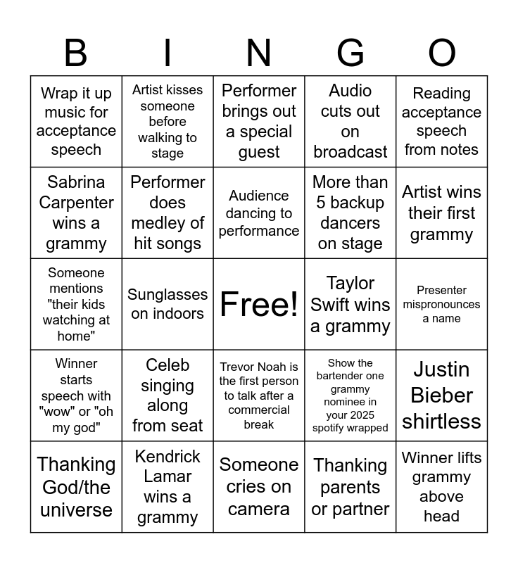 This bingo card has a free space and 29 words: Thanking God/the universe, Someone in a dress with 4+ colors, Sunglasses on indoors, Outfit reveal mid performance, Wrap it up music for acceptance speech, Performer brings out a special guest, Performer does medley of hit songs, Celeb singing along from seat, Taylor Swift wins a grammy, Kendrick Lamar wins a grammy, Presenter mispronounces a name, Winner lifts grammy above head, Someone cries on camera, Thanking parents or partner, Artist wins their first grammy, Artist wins multiple grammys, Trevor Noah is the first person to talk after a commercial break, Winner starts speech with "wow" or "oh my god", Reading acceptance speech from notes, Someone mentions "their kids watching at home", Show the bartender one grammy nominee in your 2025 spotify wrapped, "This is for the fans", More than 5 backup dancers on stage, Sabrina Carpenter wins a grammy, Audio cuts out on broadcast, Artist kisses someone before walking to stage, Justin Bieber shirtless, Audience dancing to performance and Someone makes a "67" joke.