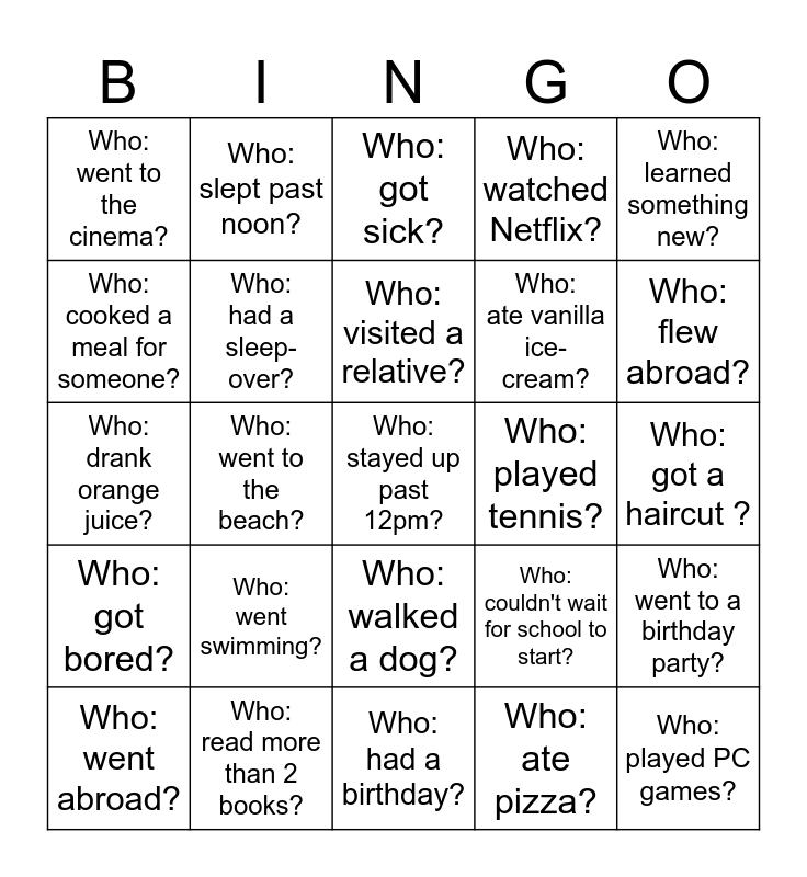 This bingo card has a free space and 24 words: Who: went swimming?, Who: read more than 2 books?, Who: visited a relative?, Who: went abroad?, Who: learned something new?, Who: went to the cinema?, Who: cooked a meal for someone?, Who: slept past noon?, Who: played tennis?, Who: walked a dog?, Who: ate vanilla ice-cream?, Who: drank orange juice?, Who: couldn't wait for school to start?, Who: went to a birthday party?, Who: had a sleep-over?, Who: ate pizza?, Who: got a haircut ?, Who: got sick?, Who: flew abroad?, Who: went to the beach?, Who: played PC games?, Who: got bored?, Who: watched Netflix? and Who: had a birthday?.