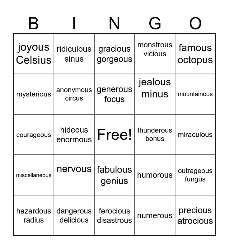 This bingo card has a free space and 24 words: nervous, dangerous delicious, generous focus, hazardous radius, famous octopus, joyous Celsius, mysterious, ridiculous sinus, thunderous bonus, fabulous genius, jealous minus, courageous, humorous, outrageous fungus, anonymous circus, numerous, miraculous, gracious gorgeous, mountainous, hideous enormous, precious atrocious, miscellaneous, monstrous vicious and ferocious disastrous.