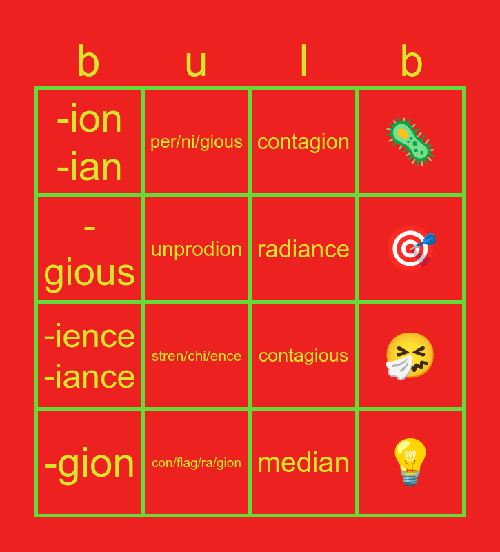 This bingo card has 16 words: -gion, con/flag/ra/gion, contagion, 🦠, -gious, per/ni/gious, contagious, 🤧, -ion -ian, unprodion, median, 🎯, -ience -iance, stren/chi/ence, radiance and 💡.