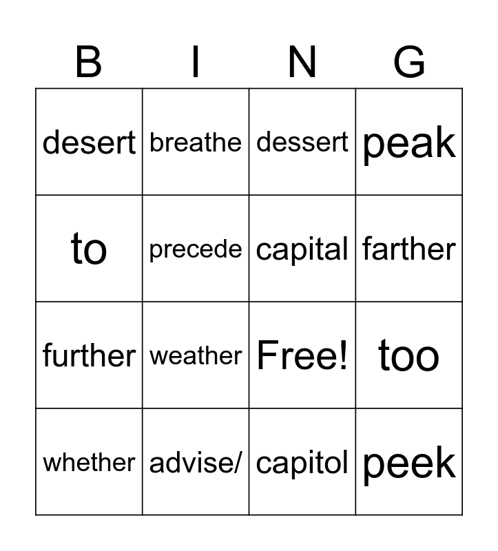 This bingo card has 21 words: advise/, advice, breathe, breath, capitol, capital, desert, dessert, Free!, farther, further, peak, peek, pique, precede, proceed, whether, weather, to, too and two.