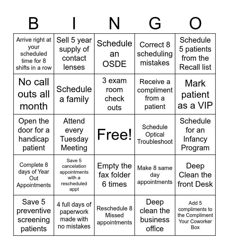 This bingo card has a free space and 24 words: Save 5 cancelation appointments with a rescheduled appt, 4 full days of paperwork made with no mistakes, 3 exam room check outs, Save 5 preventive screening patients, Schedule 5 patients from the Recall list, Arrive right at your scheduled time for 8 shifts in a row, No call outs all month, Sell 5 year supply of contact lenses, Schedule Optical Troubleshoot, Empty the fax folder 6 times, Receive a compliment from a patient, Open the door for a handicap patient, Make 8 same day appointments, Deep Clean the front Desk, Schedule a family, Deep clean the business office, Schedule for an Infancy Program, Schedule an OSDE, Mark patient as a VIP, Attend every Tuesday Meeting, Add 5 compliments to the Compliment Your Coworker Box, Complete 8 days of Year Out Appointments, Correct 8 scheduling mistakes and Reschedule 8 Missed appointments.