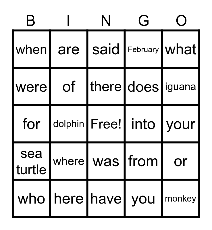 This bingo card has a free space and 24 words: where, here, there, who, what, when, were, are, into, was, does, for, from, or, of, you, your, said, iguana, dolphin, monkey, sea turtle, February and have.