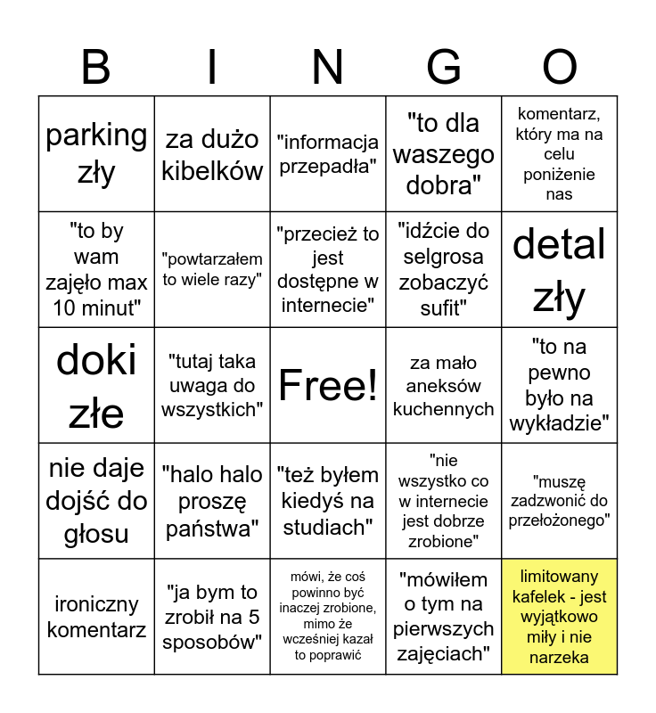 This bingo card has a free space and 24 words: "halo halo proszę państwa", "ja bym to zrobił na 5 sposobów", "przecież to jest dostępne w internecie", ironiczny komentarz, komentarz, który ma na celu poniżenie nas, parking zły, "to by wam zajęło max 10 minut", za dużo kibelków, za mało aneksów kuchennych, "też byłem kiedyś na studiach", "idźcie do selgrosa zobaczyć sufit", doki złe, "nie wszystko co w internecie jest dobrze zrobione", "muszę zadzwonić do przełożonego", "powtarzałem to wiele razy", "mówiłem o tym na pierwszych zajęciach", "to na pewno było na wykładzie", "informacja przepadła", detal zły, "tutaj taka uwaga do wszystkich", limitowany kafelek - jest wyjątkowo miły i nie narzeka, nie daje dojść do głosu, "to dla waszego dobra" and mówi, że coś powinno być inaczej zrobione, mimo że wcześniej kazał to poprawić.