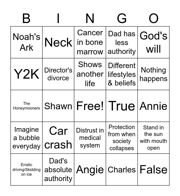 This bingo card has a free space and 24 words: Car crash, Dad's absolute authority, Shows another life, Erratic driving/Skidding on ice, God's will, Noah's Ark, Y2K, Neck, True, Distrust in medical system, Different lifestyles & beliefs, The Honeymooners, Protection from when society collapses, Stand in the sun with mouth open, Director's divorce, Charles, Annie, Cancer in bone marrow, Nothing happens, Shawn, False, Imagine a bubble everyday, Dad has less authority and Angie.