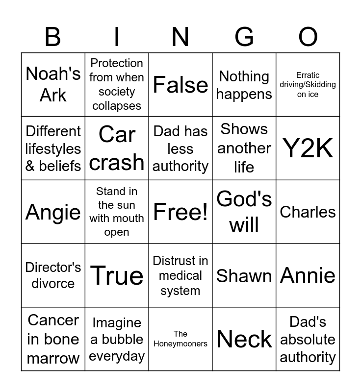 This bingo card has a free space and 24 words: True, Imagine a bubble everyday, Dad has less authority, Cancer in bone marrow, Erratic driving/Skidding on ice, Noah's Ark, Different lifestyles & beliefs, Protection from when society collapses, God's will, Distrust in medical system, Shows another life, Angie, Shawn, Annie, Car crash, Neck, Charles, False, Y2K, Stand in the sun with mouth open, Dad's absolute authority, Director's divorce, Nothing happens and The Honeymooners.