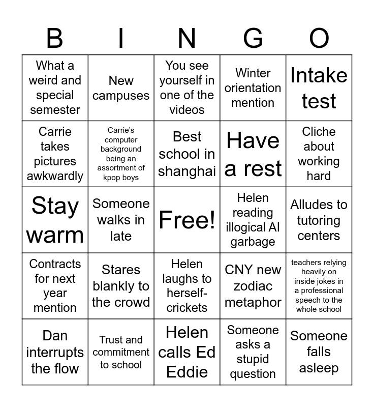 This bingo card has a free space and 24 words: Stares blankly to the crowd, Trust and commitment to school, Best school in shanghai, Dan interrupts the flow, Intake test, What a weird and special semester, Carrie takes pictures awkwardly, New campuses, Helen reading illogical AI garbage, Helen laughs to herself- crickets, Have a rest, Stay warm, CNY new zodiac metaphor, teachers relying heavily on inside jokes in a professional speech to the whole school, Carrie’s computer background being an assortment of kpop boys, Someone asks a stupid question, Alludes to tutoring centers, You see yourself in one of the videos, Cliche about working hard, Someone walks in late, Someone falls asleep, Contracts for next year mention, Winter orientation mention and Helen calls Ed Eddie.