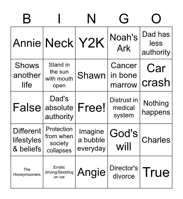 This bingo card has a free space and 24 words: Protection from when society collapses, Erratic driving/Skidding on ice, Shawn, The Honeymooners, Dad has less authority, Annie, Shows another life, Neck, Distrust in medical system, Imagine a bubble everyday, Cancer in bone marrow, False, God's will, Charles, Stand in the sun with mouth open, Director's divorce, Nothing happens, Y2K, Car crash, Dad's absolute authority, True, Different lifestyles & beliefs, Noah's Ark and Angie.