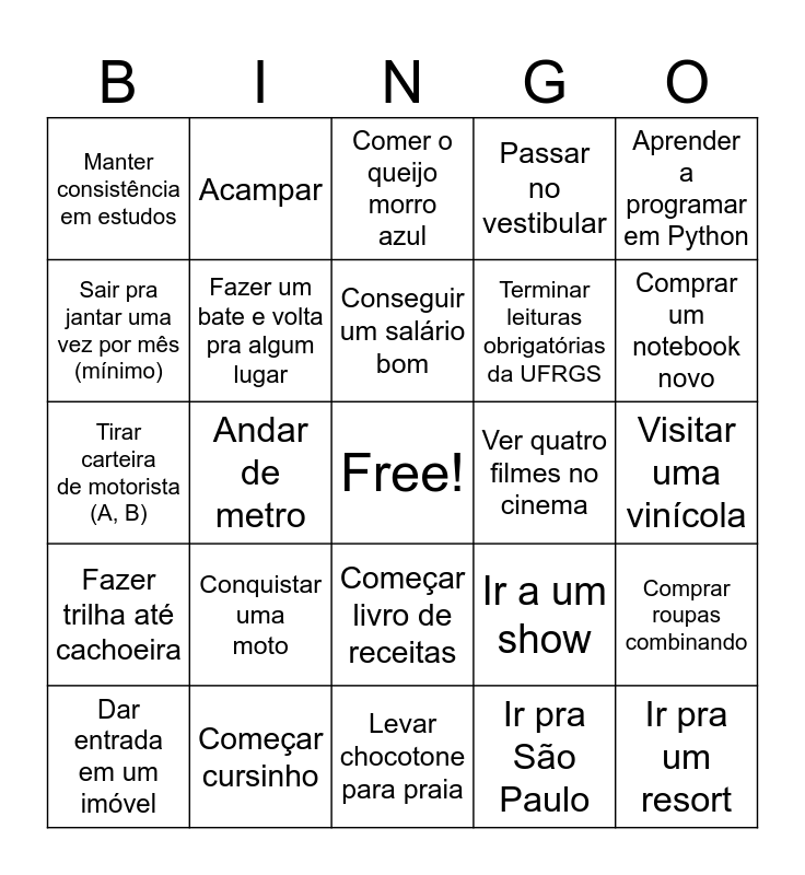 This bingo card has a free space and 24 words: Conquistar uma moto, Começar cursinho, Conseguir um salário bom, Dar entrada em um imóvel, Aprender a programar em Python, Manter consistência em estudos, Sair pra jantar uma vez por mês (mínimo), Acampar, Ver quatro filmes no cinema, Começar livro de receitas, Terminar leituras obrigatórias da UFRGS, Tirar carteira de motorista (A, B), Ir a um show, Comprar roupas combinando, Fazer um bate e volta pra algum lugar, Ir pra São Paulo, Visitar uma vinícola, Comer o queijo morro azul, Comprar um notebook novo, Andar de metro, Ir pra um resort, Fazer trilha até cachoeira, Passar no vestibular and Levar chocotone para praia.