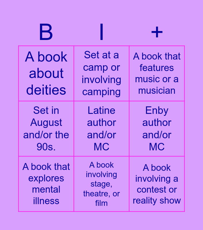 This bingo card has a free space and 8 words: Enby author and/or MC, A book that features music or a musician, Set at a camp or involving camping, A book that explores mental illness, A book about deities, A book involving a contest or reality show, Set in August and/or the 90s. and A book involving stage, theatre, or film.