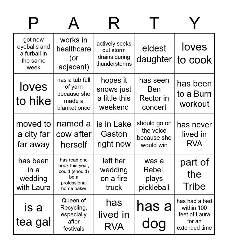 This bingo card has a free space and 30 words: Queen of Recycling, especially after festivals, was raised on breakfast dessert, named a cow after herself, has lived with more than 1 flying squirrel, got new eyeballs and a furball in the same week, actively seeks out storm drains during thunderstorms, has a tub full of yarn because she made a blanket once, left her wedding on a fire truck, should go on the voice because she would win, has lived in RVA, has never lived in RVA, has had a bed within 100 feet of Laura for an extended time, has a dog, traveled more than 4 hours to get here, has been to a Burn workout, has lived in Raleigh, was a Rebel, plays pickleball, has been in a wedding with Laura, has read one book this year, could (should) be a professional home baker, loves to cook, moved to a city far far away, has eaten 12 grapes under a table, works in healthcare (or adjacent), has seen Ben Rector in concert, loves to hike, eldest daughter, part of the Tribe, is a tea gal, hopes it snows just a little this weekend and loves to decorate for Christmas.