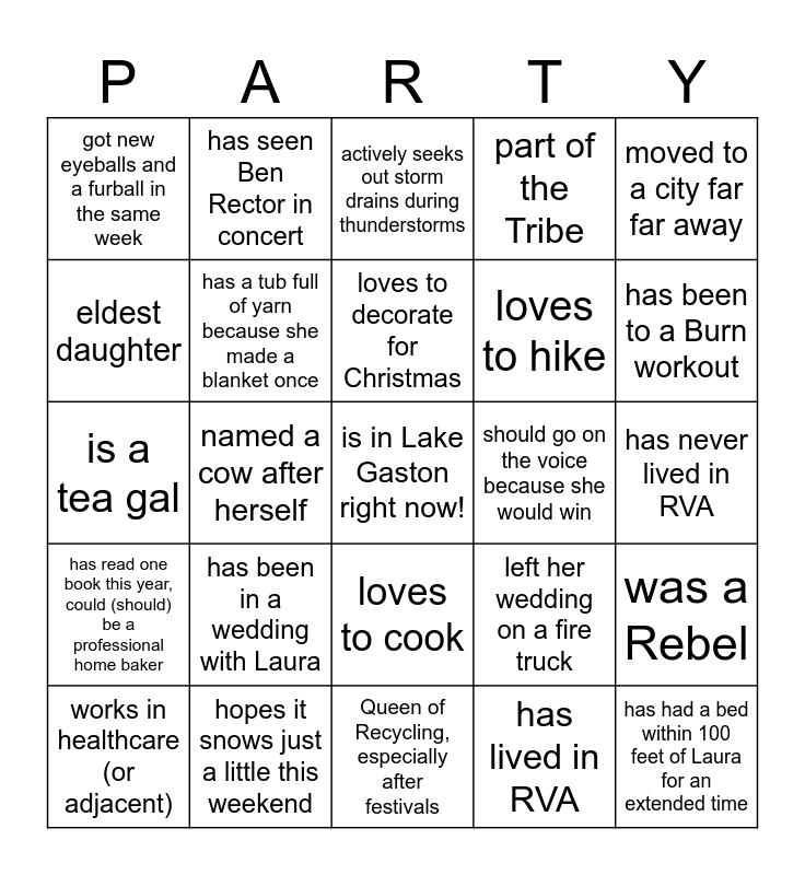This bingo card has a free space and 31 words: Queen of Recycling, especially after festivals, was raised on breakfast dessert, named a cow after herself, has lived with more than 1 flying squirrel, got new eyeballs and a furball in the same week, actively seeks out storm drains during thunderstorms, has a tub full of yarn because she made a blanket once, left her wedding on a fire truck, should go on the voice because she would win, has lived in RVA, has never lived in RVA, has had a bed within 100 feet of Laura for an extended time, has a dog, traveled more than 4 hours to get here, has been to a Burn workout, has lived in Raleigh, was a Rebel, has been in a wedding with Laura, has read one book this year, could (should) be a professional home baker, loves to cook, moved to a city far far away, has eaten 12 grapes under a table, works in healthcare (or adjacent), has seen Ben Rector in concert, loves to hike, eldest daughter, part of the Tribe, is a tea gal, hopes it snows just a little this weekend, loves to decorate for Christmas and plays pickleball.