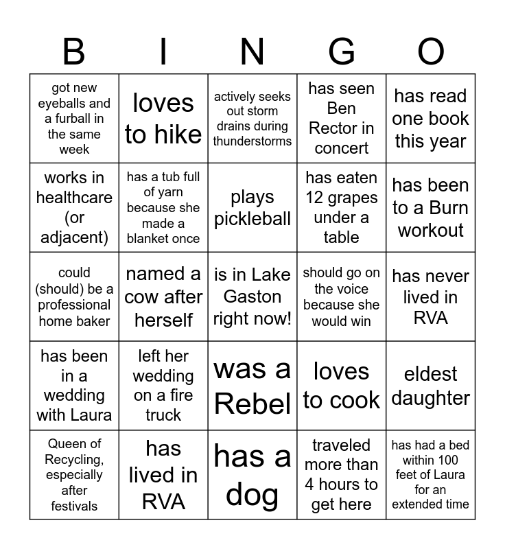 This bingo card has a free space and 29 words: Queen of Recycling, especially after festivals, was raised on breakfast dessert, named a cow after herself, has lived with more than 1 flying squirrel, got new eyeballs and a furball in the same week, actively seeks out storm drains during thunderstorms, has a tub full of yarn because she made a blanket once, left her wedding on a fire truck, should go on the voice because she would win, has lived in RVA, has never lived in RVA, has had a bed within 100 feet of Laura for an extended time, has a dog, traveled more than 4 hours to get here, has been to a Burn workout, has lived in Raleigh, was a Rebel, has been in a wedding with Laura, has read one book this year, could (should) be a professional home baker, loves to cook, moved to a city far far away, has eaten 12 grapes under a table, works in healthcare (or adjacent), has seen Ben Rector in concert, loves to hike, eldest daughter, plays pickleball and is a tea gal.