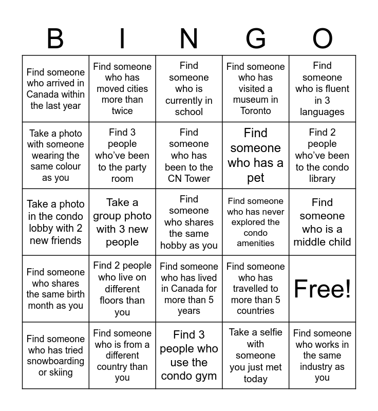 This bingo card has 26 words: Find someone who has lived in Canada for more than 5 years, Take a selfie with someone you just met today, Find someone who has been to the CN Tower, Find someone who is from a different country than you, Find someone who is fluent in 3 languages, Find someone who arrived in Canada within the last year, Take a photo with someone wearing the same colour as you, Find someone who has moved cities more than twice, Find someone who is a middle child, Find someone who has travelled to more than 5 countries, Find someone who has a pet, Take a photo in the condo lobby with 2 new friends, Free!, Find someone who has tried snowboarding or skiing, Take a group photo with 3 new people, Find someone who prefers summer over winter, Find someone who has visited a museum in Toronto, Find someone who shares the same birth month as you, Find someone who is currently in school, Find someone who shares the same hobby as you, Find 2 people who’ve been to the condo library, Find 3 people who use the condo gym, Find someone who has never explored the condo amenities, Find 2 people who live on different floors than you, Find 3 people who’ve been to the party room and Find someone who works in the same industry as you.