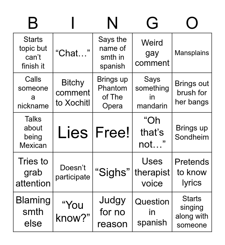 This bingo card has a free space and 27 words: Uses therapist voice, Changes the subject, Says something in mandarin, Judgy for no reason, Calls someone a nickname, Says the name of smth in spanish, “Chat…”, Tries to grab attention, “Oh that’s not…”, Pretends to know lyrics, Talks about being Mexican, Weird gay comment, Blaming smth else, “You know?”, Brings out brush for her bangs, Calls them “The Kids”, Bitchy comment to Xochitl, Brings up Phantom of The Opera, Doesn’t participate, Starts topic but can’t finish it, Brings up Sondheim, Question in spanish, Lies, Starts singing along with someone, “Sighs”, Mansplains and “This is my new vocal stim”.