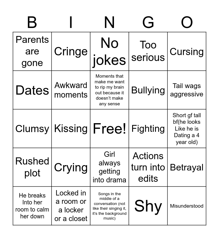This bingo card has a free space and 24 words: Crying, Locked in a room or a locker or a closet, Moments that make me want to rip my brain out because it doesn’t make any sense, He breaks Into her room to calm her down, Cursing, Parents are gone, Dates, Cringe, Fighting, Girl always getting into drama, Bullying, Clumsy, Actions turn into edits, Betrayal, Awkward moments, Shy, Short gf tall bf(he looks Like he is Dating a 4 year old), No jokes, Tail wags aggressive, Kissing, Misunderstood, Rushed plot, Too serious and Songs in the middle of a conversation (not like their singing it, it’s the background music).