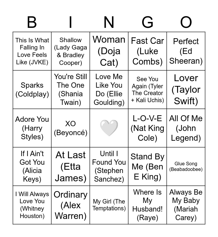 This bingo card has a free space and 33 words: Just The Way You Are (Bruno Mars), I Want To Know What Love Is (Foreigner), XO (Beyoncé), Lift Me Up (Rihanna), If I Ain't Got You (Alicia Keys), You're Still The One (Shania Twain), Perfect (Ed Sheeran), I Will Always Love You (Whitney Houston), Shallow (Lady Gaga & Bradley Cooper), We Found Love (Rihanna), Love Me Like You Do (Ellie Goulding), Woman (Doja Cat), Lovefool (The Cardigans), Count On Me (Bruno Mars), L-O-V-E (Nat King Cole), Lover (Taylor Swift), Ordinary (Alex Warren), Adore You (Harry Styles), At Last (Etta James), Stand By Me (Ben E King), Until I Found You (Stephen Sanchez), Lil Boo Thang (Paul Russell), This Is What Falling In Love Feels Like (JVKE), All Of Me (John Legend), My Girl (The Temptations), Always Be My Baby (Mariah Carey), Fast Car (Luke Combs), See You Again (Tyler The Creator + Kali Uchis), Sparks (Coldplay), Glue Song (Beabadoobee), Golden Hour (Kacey Musgraves), Where Is My Husband! (Raye) and So Easy To Fall In Love (Olivia Dean).