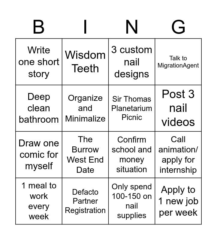 This bingo card has 16 words: Defacto Partner Registration, Call animation/ apply for internship, 3 custom nail designs, Write one short story, Draw one comic for myself, Wisdom Teeth, Confirm school and money situation, Only spend 100-150 on nail supplies, Deep clean bathroom, Organize and Minimalize, 1 meal to work every week, Talk to MigrationAgent, The Burrow West End Date, Post 3 nail videos, Sir Thomas Planetarium Picnic and Apply to 1 new job per week.
