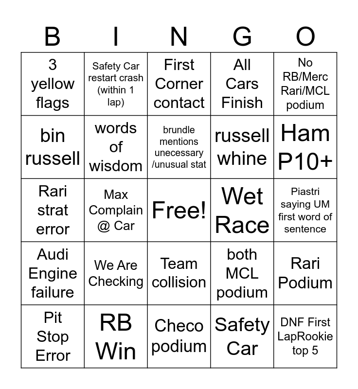 This bingo card has a free space and 44 words: Red Bull podium, DNF First LapRookie top 5, 2+Red Flags, Pit Stop Error, DNF, Safety Car, First Corner contact, Car on Fire/smoke, No RB/Merc Rari/MCL podium, RB Win, All Cars Finish, Wet Race, Team collision, We Are Checking, Ocon Penalty, Checo podium, Max Win, Rari strat error, Puncture, Ham P10+, Safety Car restart crash (within 1 lap), Hulk podium, Williams Points, 3 yellow flags, Bottas drinking something, Piastri saying UM first word of sentence, Norris mum being on cam, Penelope on cam, both MCL podium, Audi Engine failure, Rari Engine failure, Rari Podium, 3 DNF, Pit Start, Max Complain @ Car, Beached, Norris track limits, Cadillac Q3, brundle mentions unecessary /unusual stat, bin russell, russell whine, linblad dive bomb, words of wisdom and complain wind.