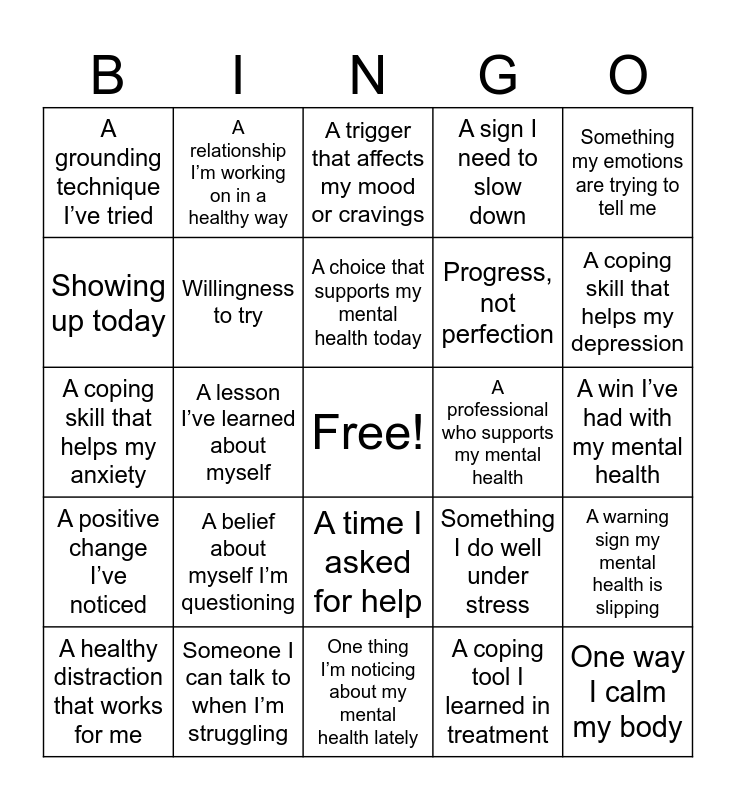 This bingo card has a free space and 44 words: A feeling I’m learning to name, One way I calm my body, A thought pattern I’m trying to change, A healthy distraction that works for me, A mental health symptom I’m more aware of, A coping tool I learned in treatment, A trigger that affects my mood or cravings, Something that helps when I feel overwhelmed, Something my emotions are trying to tell me, Someone I can talk to when I’m struggling, A sign I need to slow down, A professional who supports my mental health, A time I asked for help, A belief about myself I’m questioning, A boundary I’m practicing, One thing I’m noticing about my mental health lately, A way I communicate my needs better now, A coping skill that helps my anxiety, A space that helps me when I am overwhelmed, A coping skill that helps my depression, A relationship I’m working on in a healthy way, Something that helps when my thoughts race, Something I’m proud of surviving, A grounding technique I’ve tried, A strength that helps my recovery, A win I’ve had with my mental health, A moment I showed self-control, A time I didn’t give up, Something I do well under stress, A positive change I’ve noticed, A quality I like about myself, A warning sign my mental health is slipping, A relapse or symptom sign I now recognize, Something I do differently when I’m struggling, A lesson I’ve learned about myself, A habit that supports my stability, A step I can take to protect my recovery, Something I’m still working on (no judgment), A choice that supports my mental health today, Showing up today, Progress, not perfection, Taking care of myself, Willingness to try and Still learning.