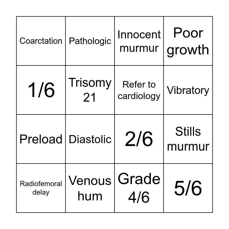 This bingo card has 29 words: Free!, VSD, Stills murmur, ASD, Coarctation, Innocent murmur, Refer to cardiology, Don't refer to cardiology, Venous hum, Thrill, Grade 4/6, Radiofemoral delay, PPS, HOCM, Diastolic, Systolic ejection, Holosystolic, 5/6, 1/6, 2/6, 3/6, Click, Preload, Trisomy 21, Poor growth, Pathologic, Low-pitched, Vibratory and AV canal defect.