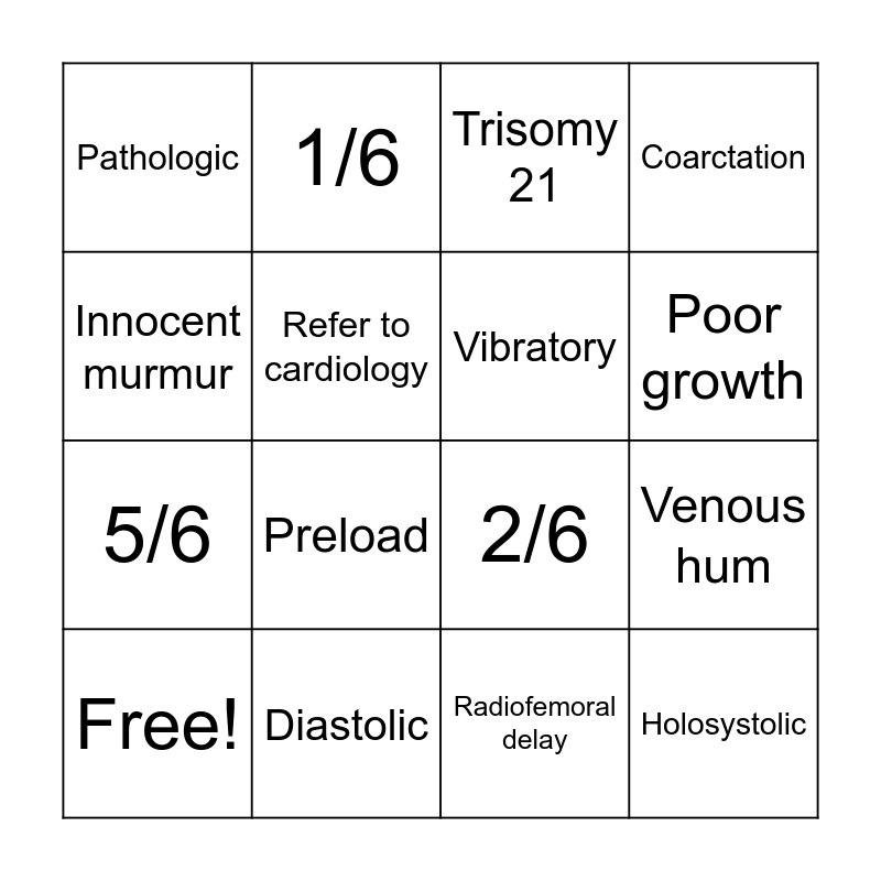 This bingo card has 29 words: Free!, VSD, Stills murmur, ASD, Coarctation, Innocent murmur, Refer to cardiology, Don't refer to cardiology, Venous hum, Thrill, 4/6, Radiofemoral delay, PPS, HOCM, Diastolic, Systolic ejection, Holosystolic, 5/6, 1/6, 2/6, 3/6, Click, Preload, Trisomy 21, Poor growth, Pathologic, Low-pitched, Vibratory and AV canal defect.