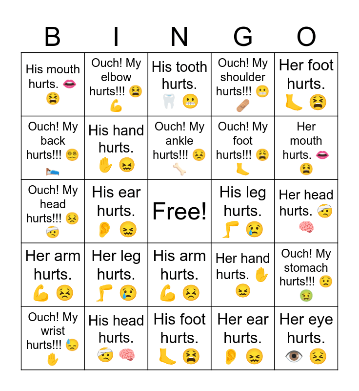 This bingo card has a free space and 30 words: His head hurts. ðĪ ð§ , His eye hurts. ðïļ ðĢ, His ear hurts. ð ð, His nose hurts. ð ðĒ, His mouth hurts. ð ðŦ, His tooth hurts. ðĶ· ðŽ, His hand hurts. â ð, His arm hurts. ðŠ ðĢ, His leg hurts. ðĶĩ ðĒ, His foot hurts. ðĶķ ðŦ, Her head hurts. ðĪ ð§ , Her eye hurts. ðïļ ðĢ, Her ear hurts. ð ð, Her nose hurts. ð ðĒ, Her mouth hurts. ð ðŦ, Her tooth hurts. ðĶ· ðŽ, Her hand hurts. â ð, Her arm hurts. ðŠ ðĢ, Her leg hurts. ðĶĩ ðĒ, Her foot hurts. ðĶķ ðŦ, Ouch! My head hurts!!! ðĢðĪ, Ouch! My knee hurts!!! ððĶĩ, Ouch! My elbow hurts!!! ðŦðŠ, Ouch! My foot hurts!!! ðĐðĶķ, Ouch! My back hurts!!! ðĩâðŦð, Ouch! My shoulder hurts!!! ðŽðĐđ, Ouch! My stomach hurts!!! ððĪĒ, Ouch! My wrist hurts!!! ðâ, Ouch! My ankle hurts!!! ðĢðĶī and Ouch! My neck hurts!!! ðð§Ģ.