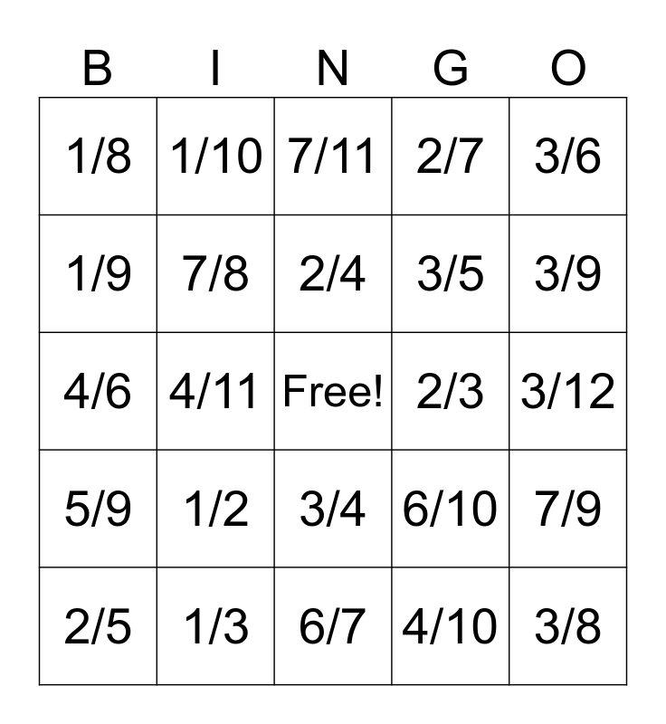This bingo card has a free space and 24 words: 1/2, 1/3, 2/4, 2/5, 3/6, 1/8, 1/9, 1/10, 2/3, 3/4, 3/5, 4/6, 6/10, 7/9, 7/8, 4/10, 3/12, 7/11, 3/9, 4/11, 3/8, 5/9, 2/7 and 6/7.