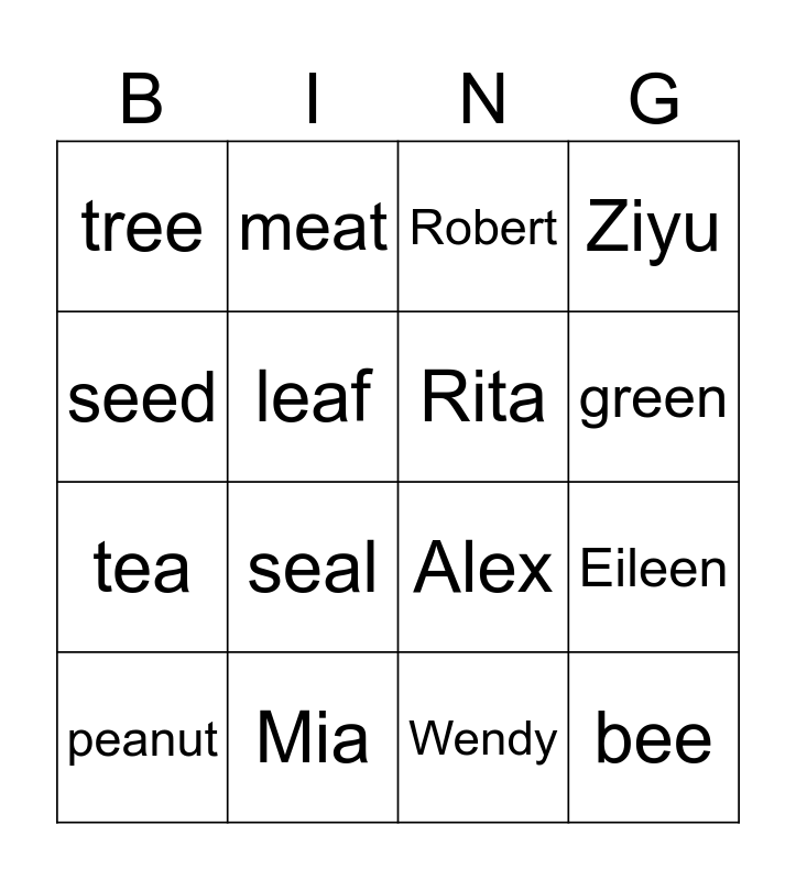 This bingo card has 23 words: bee, feet, green, peel, seed, tree, leaf, meat, peanut, sea, seal, tea, Michael, Orange, Mia, Cici, Robert, Alex, Rita, Eileen, Ziyu, Wendy and Caicy.