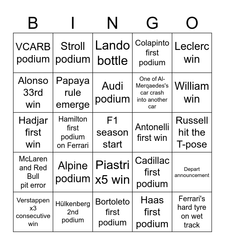 This bingo card has a free space and 24 words: Alpine podium, Hülkenberg 2nd podium, Audi podium, Verstappen x3 consecutive win, Leclerc win, VCARB podium, Alonso 33rd win, Stroll podium, Antonelli first win, Piastri x5 win, One of Al-Merqaedes's car crash into another car, Hadjar first win, Cadillac first podium, Depart announcement, Papaya rule emerge, Haas first podium, Russell hit the T-pose, Lando bottle, William win, Hamilton first podium on Ferrari, Ferrari's hard tyre on wet track, McLaren and Red Bull pit error, Colapinto first podium and Bortoleto first podium.