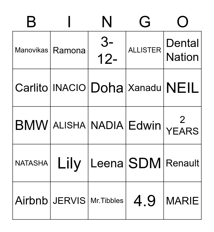 This bingo card has 25 words: Lily, Mr.Tibbles, Doha, Airbnb, Dental Nation, Manovikas, Carlito, Ramona, Edwin, Leena, Xanadu, BMW, SDM, Renault, INACIO, MARIE, 2 YEARS, 3-12-, NEIL, ALISHA, NADIA, JERVIS, NATASHA, ALLISTER and 4.9.