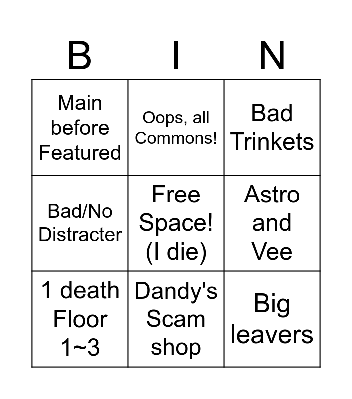 This bingo card has a free space and 8 words: Bad/No Distracter, Oops, all Commons!, Astro and Vee, 1 death Floor 1~3, Bad Trinkets, Main before Featured, Dandy's Scam shop and Big leavers.