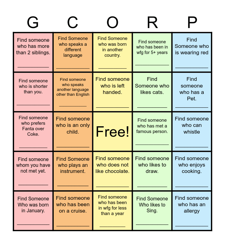 This bingo card has a free space and 25 words: Find Someone Who was born in January. ____________, Find Someone who plays an instrument. ___________, Find someone who is left handed. ___________, Find Someone Who likes to Sing. ____________, Find someone who has a Pet. ___________, Find someone who has more than 2 siblings. ___________, Find Someone who speaks a different language _____________, Find Someone who was born in another country. ___________, Find Someone who likes cats. __________, Find someone who enjoys cooking. ___________, Find someone who prefers Fanta over Coke. ___________, Find someone who speaks another language other than English ____________, Find someone who likes to draw. __________, Find someone who has an allergy ___________, Find someone who is shorter than you. _____________, Find someone who has been on a cruise. ___________, Find someone who has been in wfg for less than a year __________, Find someone who has been in wfg for 5+ years ______________, Find someone who can whistle ___________, Find someone whom you have not met yet. ___________, Find someone who is an only child. ___________, Find someone who does not like chocolate. ___________, Find someone who has met a famous person. _____________, Find Someone who is wearing red ___________ and Find someone who is wearing a blue shirt. ____________.