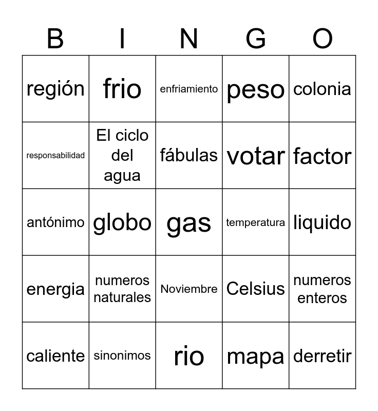 This bingo card has a free space and 31 words: rio, oceano, globo, colonia, región, enfriamiento, El ciclo del agua, Celsius, temperatura, mapa, liquido, derretir, congelado, solido, factor, producto, numeros enteros, numeros naturales, energia, Noviembre, colonia, clima, caliente, frio, votar, responsabilidad, peso, antónimo, sinonimos, fábulas and Forma estándar.