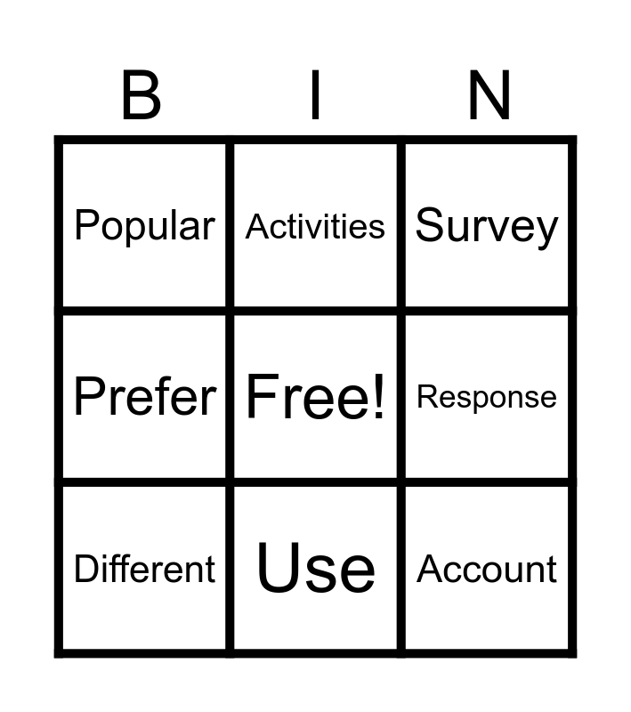 This bingo card has a free space and 8 words: Response, Survey, Activities, Different, Popular, Account, Prefer and Use.