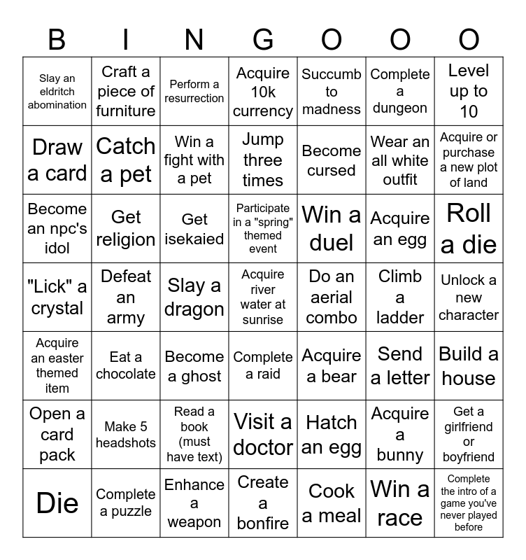 This bingo card has 49 words: Acquire a bunny, Wear an all white outfit, Cook a meal, Defeat an army, Get isekaied, Unlock a new character, Craft a piece of furniture, Enhance a weapon, Complete a dungeon, Complete a raid, Level up to 10, Acquire 10k currency, Acquire an egg, Win a duel, Make 5 headshots, Climb a ladder, Draw a card, Acquire or purchase a new plot of land, Get a girlfriend or boyfriend, Succumb to madness, Become cursed, Slay a dragon, Slay an eldritch abomination, Catch a pet, Die, Win a fight with a pet, Roll a die, Complete a puzzle, Participate in a "spring" themed event, Get religion, Complete the intro of a game you've never played before, Do an aerial combo, Open a card pack, Read a book (must have text), "Lick" a crystal, Acquire a bear, Send a letter, Build a house, Become an npc's idol, Become a ghost, Visit a doctor, Acquire an easter themed item, Acquire river water at sunrise, Create a bonfire, Jump three times, Perform a resurrection, Hatch an egg, Eat a chocolate and Win a race.
