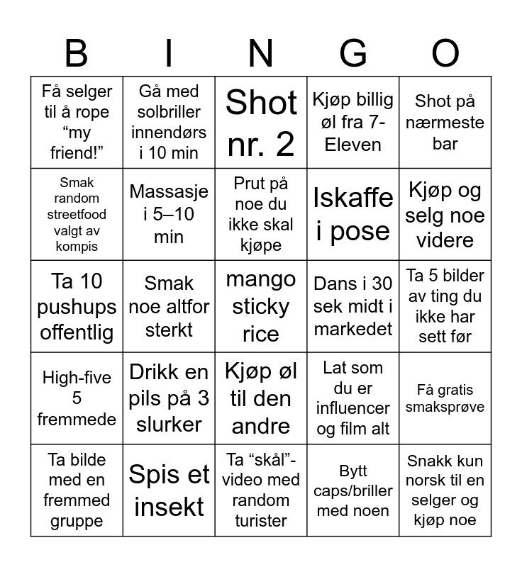 This bingo card has a free space and 24 words: Drikk en pils på 3 slurker, Spis et insekt, Prut på noe du ikke skal kjøpe, Ta bilde med en fremmed gruppe, Shot på nærmeste bar, Få selger til å rope “my friend!”, Smak random streetfood valgt av kompis, Gå med solbriller innendørs i 10 min, Dans i 30 sek midt i markedet, Kjøp øl til den andre, Iskaffe i pose, Ta 10 pushups offentlig, Lat som du er influencer og film alt, Få gratis smaksprøve, Massasje i 5–10 min, Bytt caps/briller med noen, Ta 5 bilder av ting du ikke har sett før, Shot nr. 2, Kjøp og selg noe videre, Smak noe altfor sterkt, Snakk kun norsk til en selger og kjøp noe, High-five 5 fremmede, Kjøp billig øl fra 7-Eleven and Ta “skål”-video med random turister.