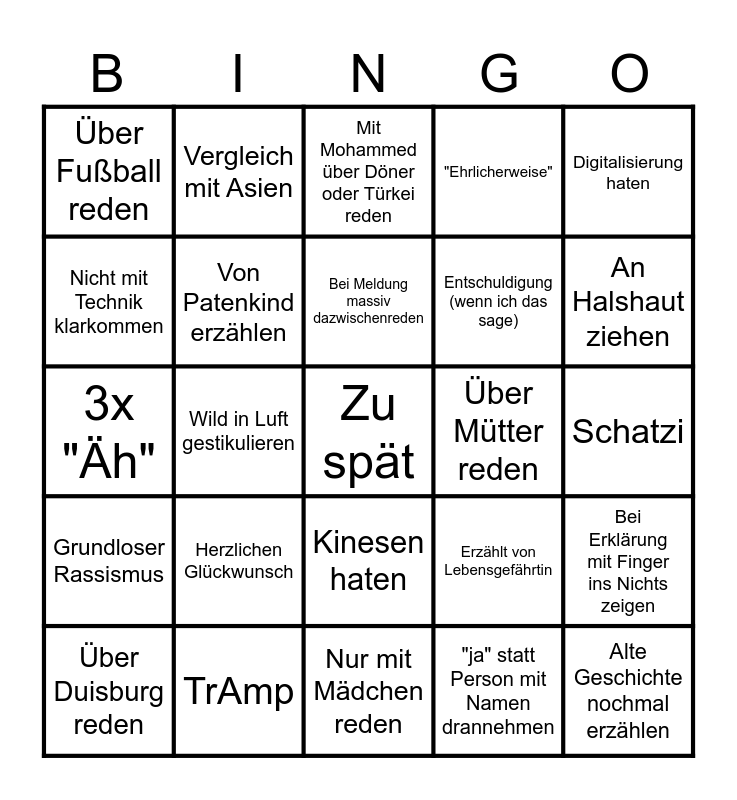 This bingo card has 29 words: Über Duisburg reden, Nicht mit Technik klarkommen, Wild in Luft gestikulieren, Alte Geschichte nochmal erzählen, Über Fußball reden, Mit Mohammed über Döner oder Türkei reden, Von Patenkind erzählen, Herzlichen Glückwunsch, Über Mütter reden, TrAmp, Schatzi, Zu spät, Nur mit Mädchen reden, "ja" statt Person mit Namen drannehmen, An Halshaut ziehen, Ding verspätet aus LZ holen, Kinesen haten, Grundloser Rassismus, Digitalisierung haten, 3x "Äh", Erzählt von Lebensgefährtin, Mit Brille spielen, Entschuldigung (wenn ich das sage), Nicht mit Technik klarkommen, "Ehrlicherweise", Vergleich mit Asien, Bei Erklärung mit Finger ins Nichts zeigen, Bei Meldung massiv dazwischenreden and Brille vom Kopf und dann in den Mund.