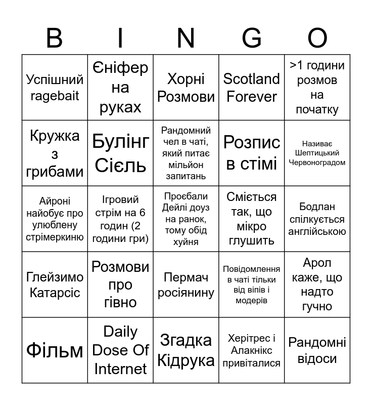 This bingo card has a free space and 24 words: Розмови про гівно, Daily Dose Of Internet, Рандомний чел в чаті, який питає мільйон запитань, Фільм, >1 години розмов на початку, Успішний ragebait, Кружка з грибами, Єніфер на руках, Сміється так, що мікро глушить, Пермач росіянину, Розпис в стімі, Айроні найобує про улюблену стрімеркиню, Повідомлення в чаті тільки від віпів і модерів, Арол каже, що надто гучно, Булінг Сієль, Херітрес і Алакнікс привіталися, Бодлан спілкується англійською, Хорні Розмови, Називає Шептицький Червоноградом, Ігровий стрім на 6 годин (2 години гри), Рандомні відоси, Глейзимо Катарсіс, Scotland Forever and Згадка Кідрука.