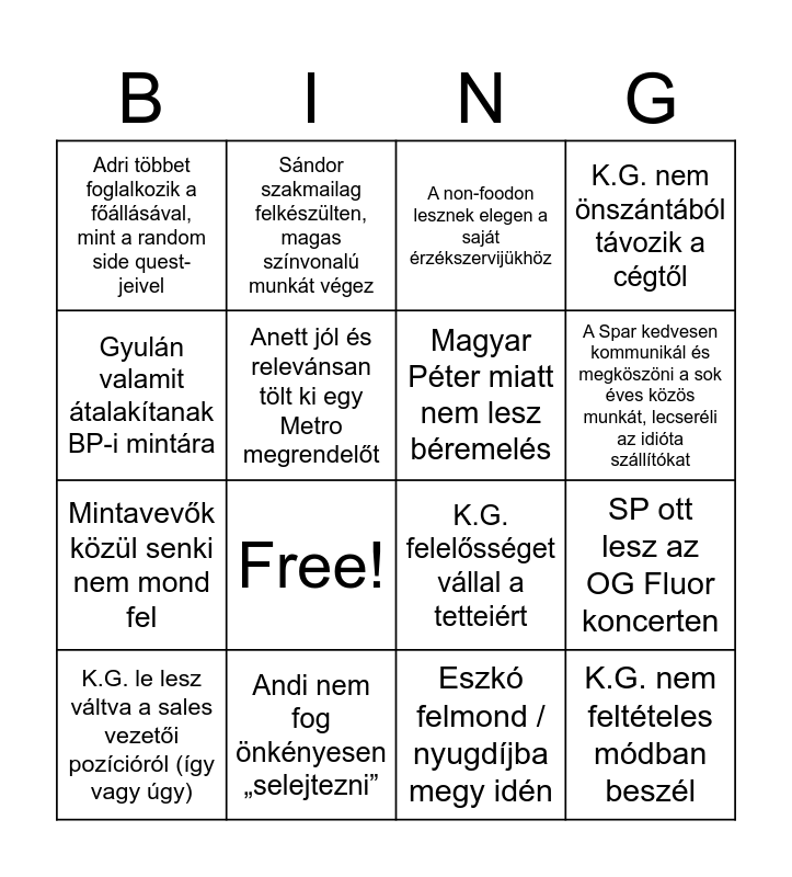 This bingo card has 18 words: Free!, K.G. nem feltételes módban beszél, A non-foodon lesznek elegen a saját érzékszervijükhöz, Adri többet foglalkozik a főállásával, mint a random side quest-jeivel, K.G. felelősséget vállal a tetteiért, K.G. nem önszántából távozik a cégtől, K.G. le lesz váltva a sales vezetői pozícióról (így vagy úgy), Sándor szakmailag felkészülten, magas színvonalú munkát végez, A Spar kedvesen kommunikál és megköszöni a sok éves közös munkát, lecseréli az idióta szállítókat, Mintavevők közül senki nem mond fel, Eszkó felmond / nyugdíjba megy idén, Gyulán valamit átalakítanak BP-i mintára, SP ott lesz az OG Fluor koncerten, Anett jól és relevánsan tölt ki egy Metro megrendelőt, Magyar Péter miatt nem lesz béremelés, Megkapjuk a karácsonyi bulis fotókat, Andi nem fog önkényesen „selejtezni” and Viki választ kap a Nébihtől.