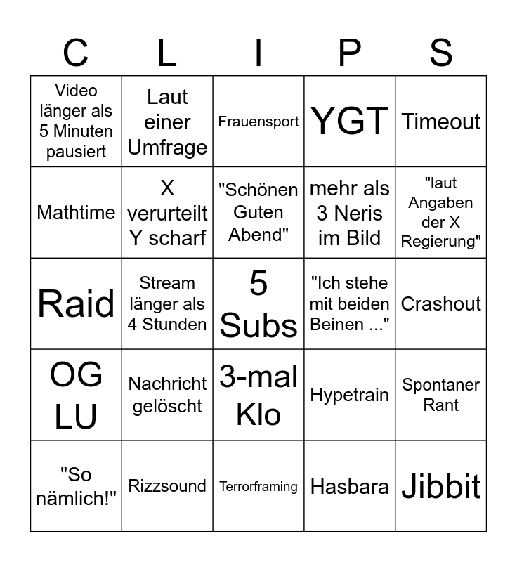 This bingo card has a free space and 34 words: kein Dinkelbrot, Hasbara, Reaktion dauert 3mal so lange wie das Video, Sidequest, OG LU, X verurteilt Y scharf, Timeout, "So nämlich!", Laut einer Umfrage, Streamerin verlässt die Cam 5mal, "Schönen Guten Abend", Frauensport, Mutmaßlich, "Distanz Herr Dobrindt", "Ich stehe mit beiden Beinen ...", "laut Angaben der X Regierung", Rizzsound, Raid, Nachricht gelöscht, Hypetrain, 3-mal Klo, Ost-Rom Mention, Video länger als 5 Minuten pausiert, Crashout, Terrorframing, Jibbit, YGT, Neri bringt dich zum lachen, mehr als 3 Neris im Bild, Mathtime, Gaming Content, Stream länger als 4 Stunden, Spontaner Rant and Karaoke.
