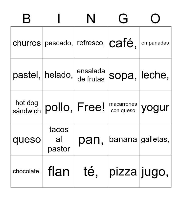 This bingo card has a free space and 38 words: tacos,, uvas, papas fritas,, helado,, galletas,, tacos al pastor, ensalada de frutas, arroz con pollo, empanadas, sopa,, pollo,, café,, jugo,, yogur, pastel,, queso, naranja, refresco,, frijoles,, macarrones con queso, churros, flan, leche,, chocolate,, ensalada,, té,, manzana, salsa, agua,, arroz,, hamburguesa, pan,, pizza, pescado,, pasta, banana, hot dog sándwich and carne,.