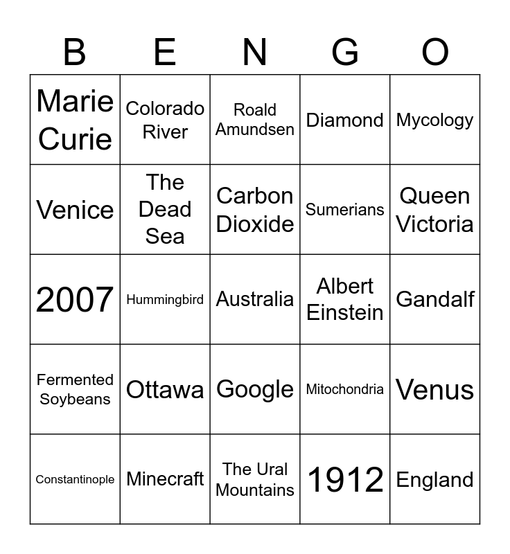 This bingo card has 51 words: Free!, Australia, Vatican City, The Ural Mountains, Ottawa, Jordan, Colorado River, Greenland, Venice, Ojos del Salado, The Dead Sea, Diamond, Venus, Mitochondria, Au, Three, Carbon Dioxide, Albert Einstein, Nitrogen, Mycology, Hummingbird, 1912, Marie Curie, Sumerians, Thomas Jefferson, England, Queen Victoria, Athens, Constantinople, Roald Amundsen, World War I, Johannes Vermeer, Arendelle, Pink Floyd, George Orwell, Minecraft, Robert Downey Jr., Central Perk, Antonio Vivaldi, Wings, Gandalf, Fermented Soybeans, Strawberry, Hypertext Transfer Protocol, Brazil, Sumo Wrestling, 2007, Chili Peppers, Gin, Google and 11.