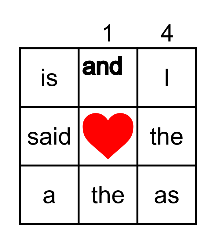 This bingo card has a free space and 8 words: the, I, and, a, is, as, said and the.