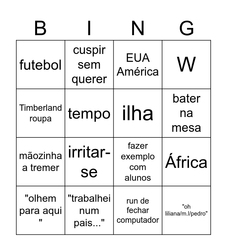 This bingo card has 16 words: "trabalhei num pais...", África, EUA América, futebol, mãozinha a tremer, cuspir sem querer, fazer exemplo com alunos, run de fechar computador, Timberland roupa, tempo, "olhem para aqui ", W, irritar-se, bater na mesa, ilha and "oh liliana/m.l/pedro".