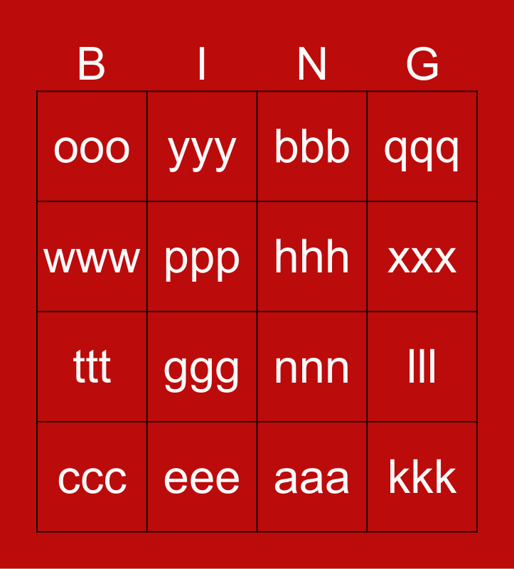 This bingo card has 16 words: ccc, eee, bbb, qqq, www, yyy, nnn, lll, ooo, ppp, aaa, xxx, ttt, ggg, hhh and kkk.