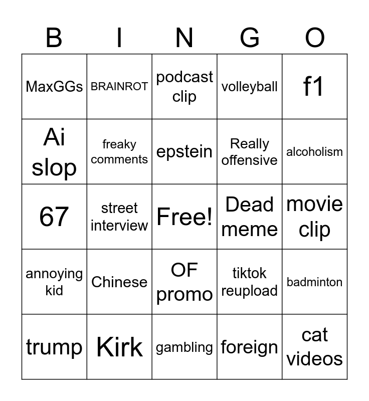This bingo card has a free space and 24 words: Chinese, Kirk, epstein, trump, f1, MaxGGs, Ai slop, BRAINROT, Dead meme, OF promo, Really offensive, 67, tiktok reupload, badminton, freaky comments, foreign, movie clip, podcast clip, alcoholism, street interview, cat videos, annoying kid, volleyball and gambling.