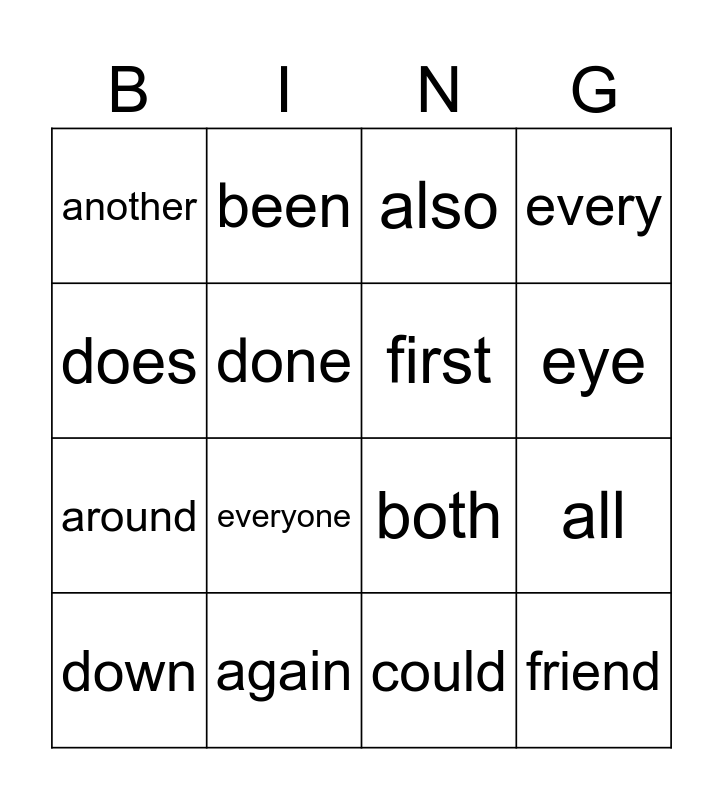 This bingo card has 16 words: again, all, also, another, around, been, both, could, does, done, down, every, everyone, eye, first and friend.